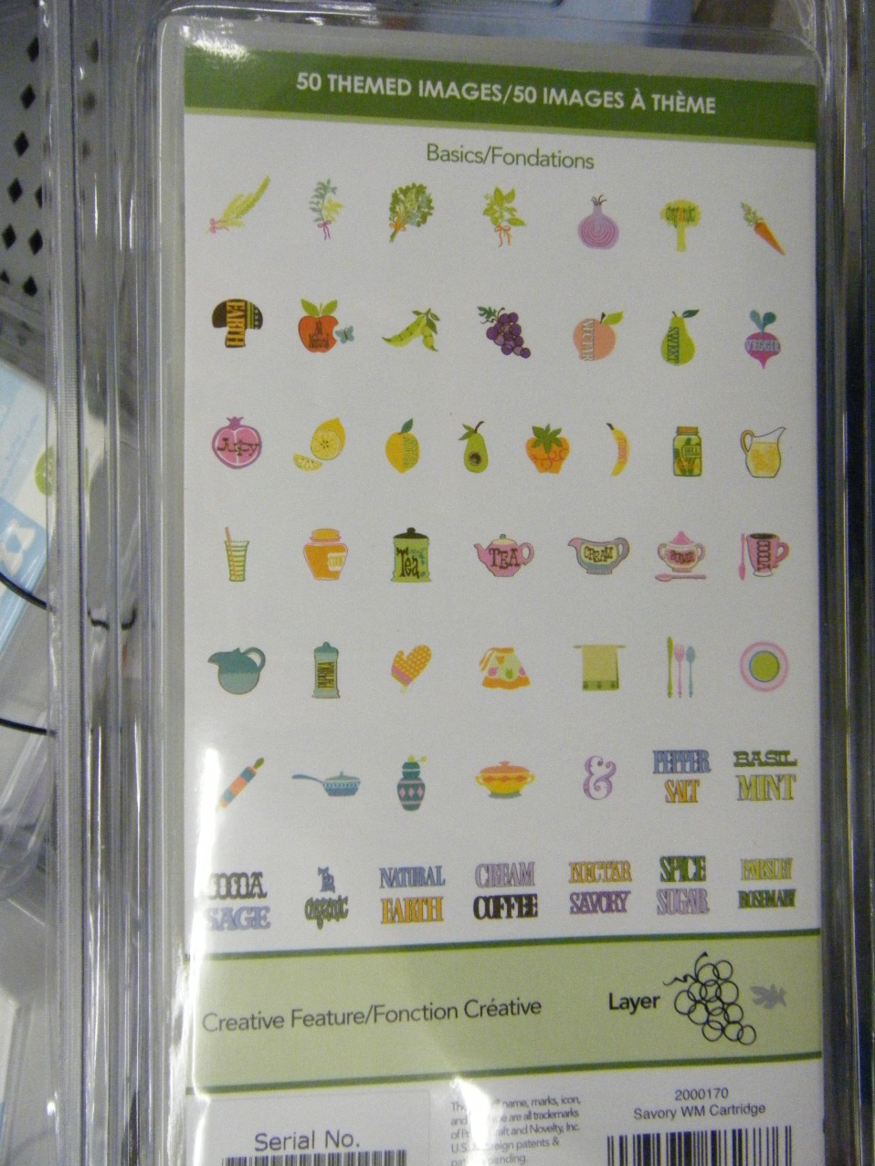 The new Cricut Lite Cartridge Savory features images of food and beverages, including a lot of fruit. There are also a few words.