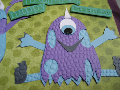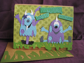 I got a BUNCH of cuttlebug folders for a ridiculous sale price at Joann.com, many of these are just perfect for monster skin and I was itching to use them. I used my stickles for accents. I used my ooeeygooey SVG as an accent on the card below. I also used a watermark inkpad to get the translucent monsters as backgrounds, many of which came from Stampin Up.
